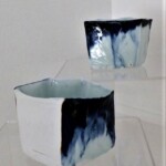 陶の削り出しによる作品でモチーフは花の形。用も兼ねるフオルムが多い。硬いフオルムから近年流れを感じさせる動きが出て来ている。色もわずかに加えられつつある。今回は造形性をめざすフオルムを追及したいとの事。新しい流れが楽しみである。