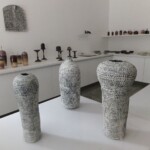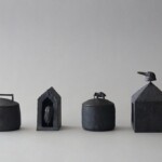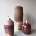 出品作品 黒釉のミニオブジェ、銅釉のへたのある小壺、白土の花器等